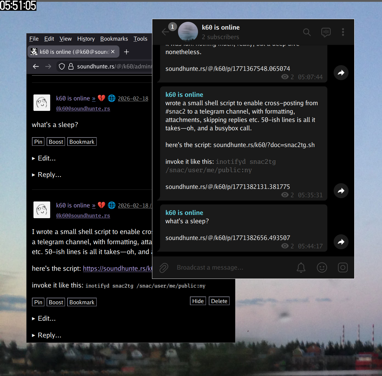 I wrote a small shell script to enable cross-posting from #snac2 to a telegram channel, with formatting, attachments, skipping replies etc. 50-ish lines is all it takes—oh, and a busybox call.