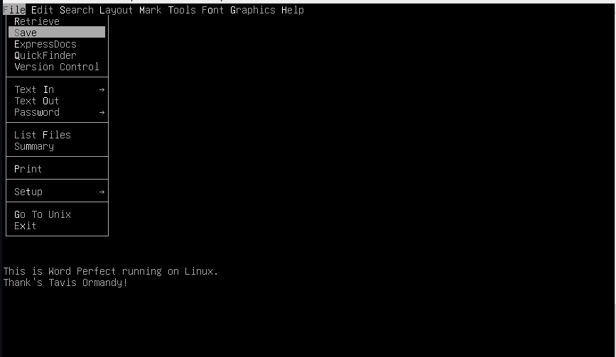 Hahaha! Tavis Ormandy released a ported version of Word Perfect for Linux a handful of years ago.